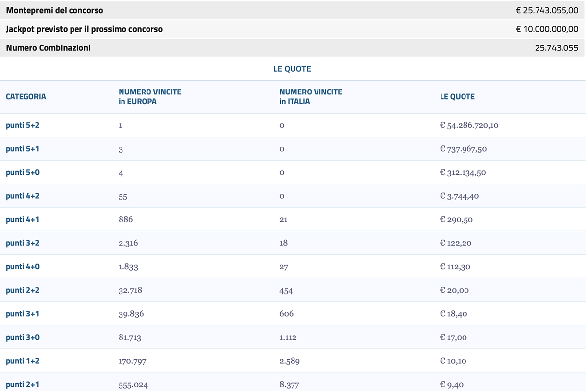 | Numeri Vincenti MillionDay | 6 | 10 | 25 | 44 | 45 |